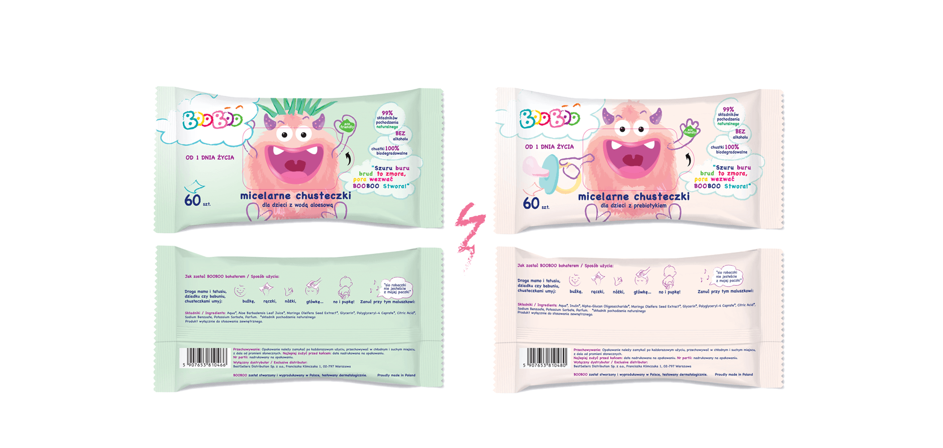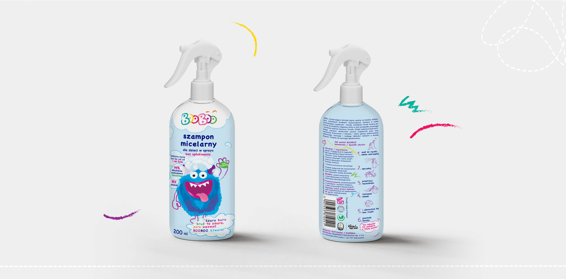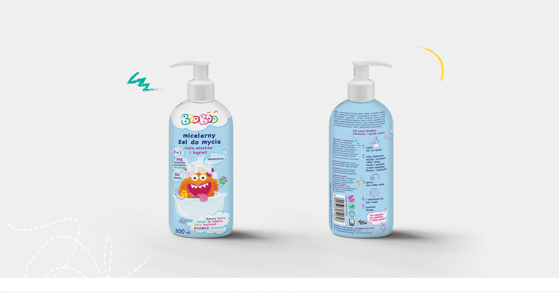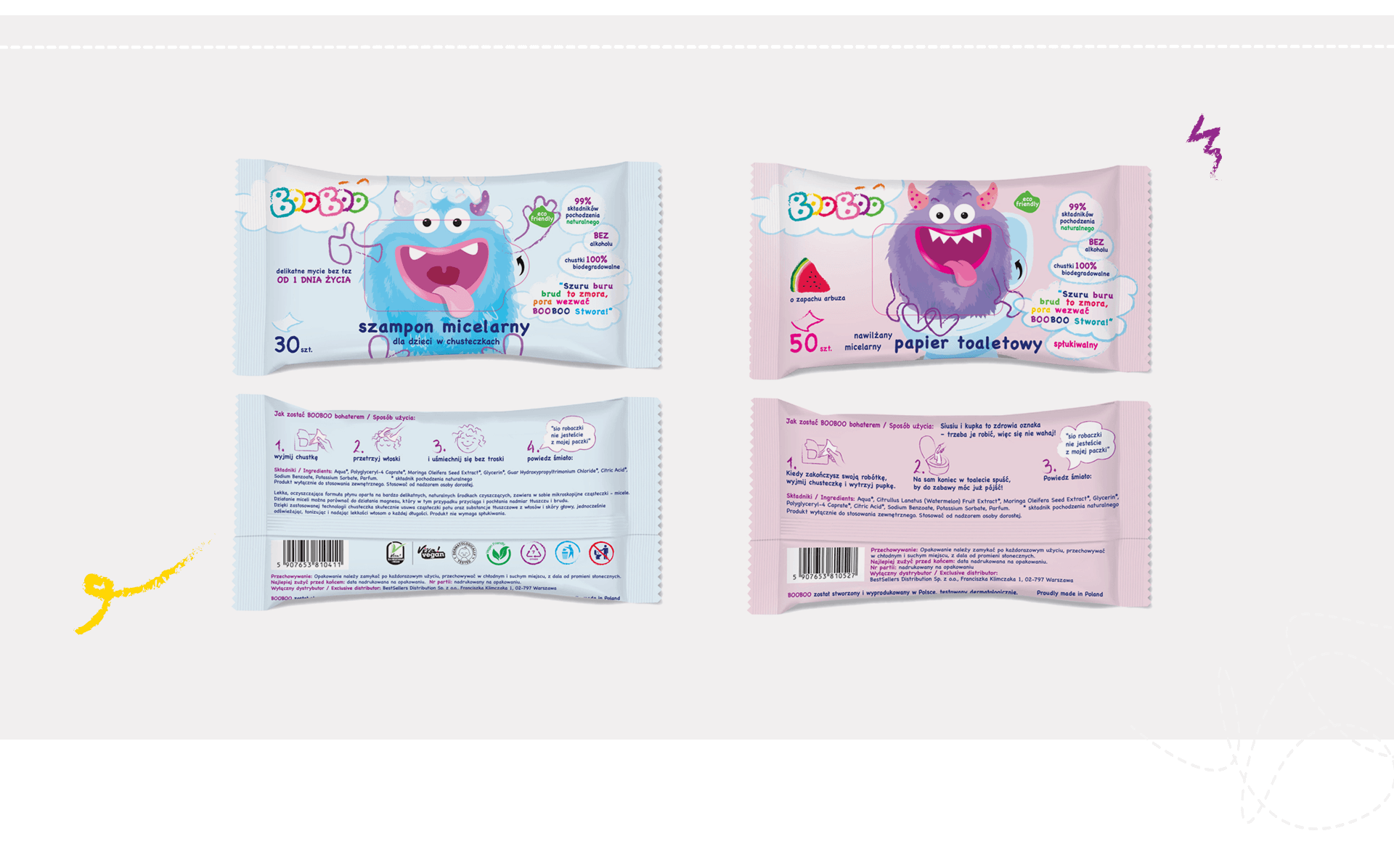 This brand concept was born in the head of our client and we added a bit ourselves, building an extremely interesting product line – micellar wipes, shampoo in wipes, a body washcube, an intimate hygiene liquid and a body gel. We have drawn a unique “BooBoo Creature” for each of the product, inspired by the function of the given product (e.g. hair washing = a creature with messy hair and bubbles).