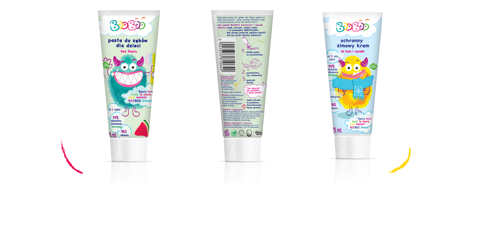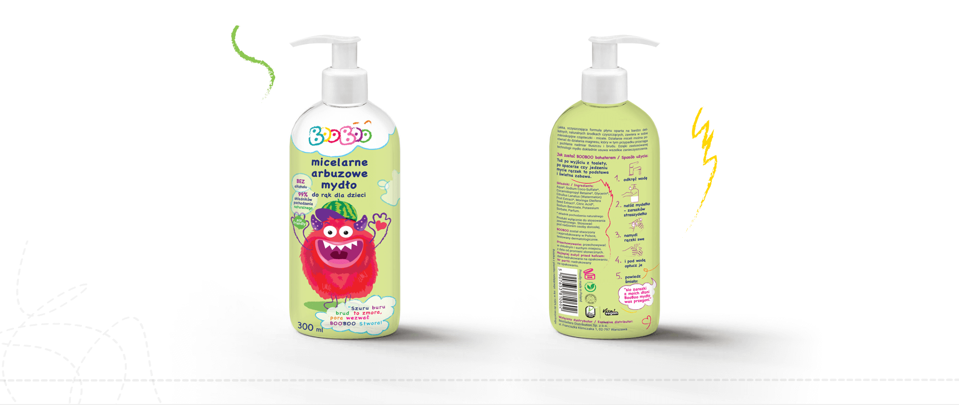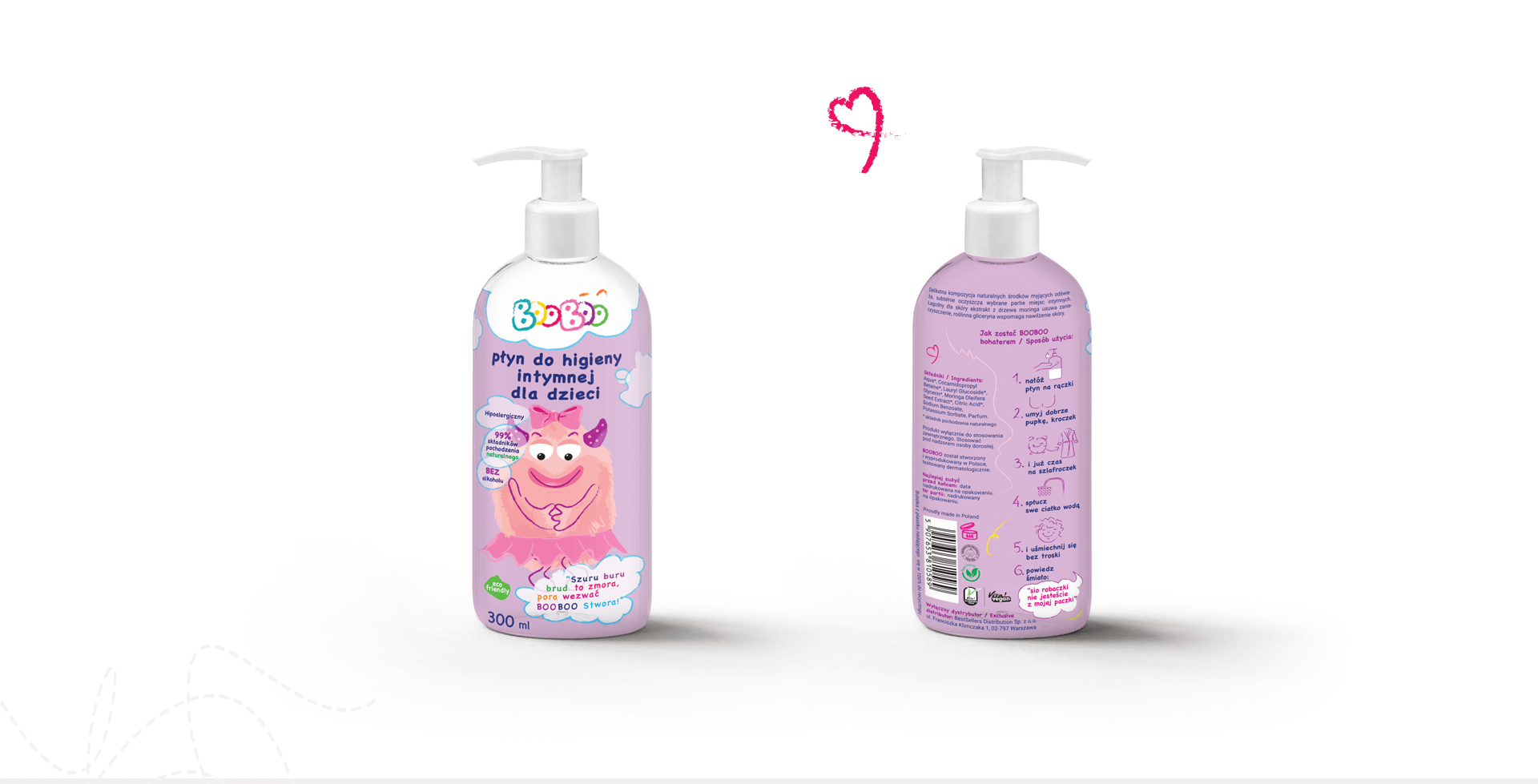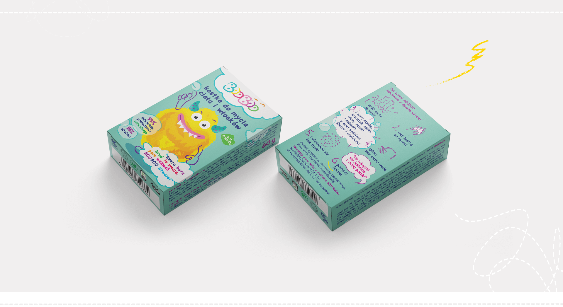 This brand concept was born in the head of our client and we added a bit ourselves, building an extremely interesting product line – micellar wipes, shampoo in wipes, a body washcube, an intimate hygiene liquid and a body gel. We have drawn a unique “BooBoo Creature” for each of the product, inspired by the function of the given product (e.g. hair washing = a creature with messy hair and bubbles).