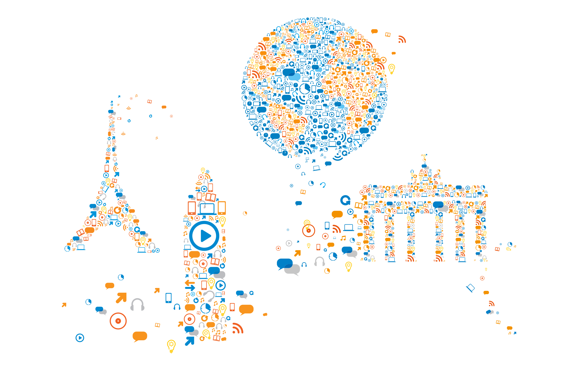 The use of icon (young, lively colours; symbols related to language learning, e.g. headphones and iPod) and creation of icon mosaics was the characteristic element of the KV. We made the mosaics in various ways, e.g. as symbols of the given language (Big Ben, the Brandenburg Gate) or the course type.