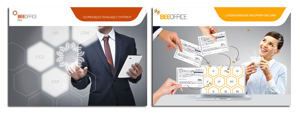 System BeeOffice wspiera życie i obieg dokumentów organizacji w sferze urlopów, delegacji, zaliczek. Można powiedzieć, że zaprowadza porządek i czyni pracę „pszczółek” bardziej efektywną. Stąd pomysł na koncept wizualny – połączenie ula-pszczółek jako symbolu pracowitości i nowoczesnej formy wizualnej rodem z filmów typu „Raport Mniejszości”.