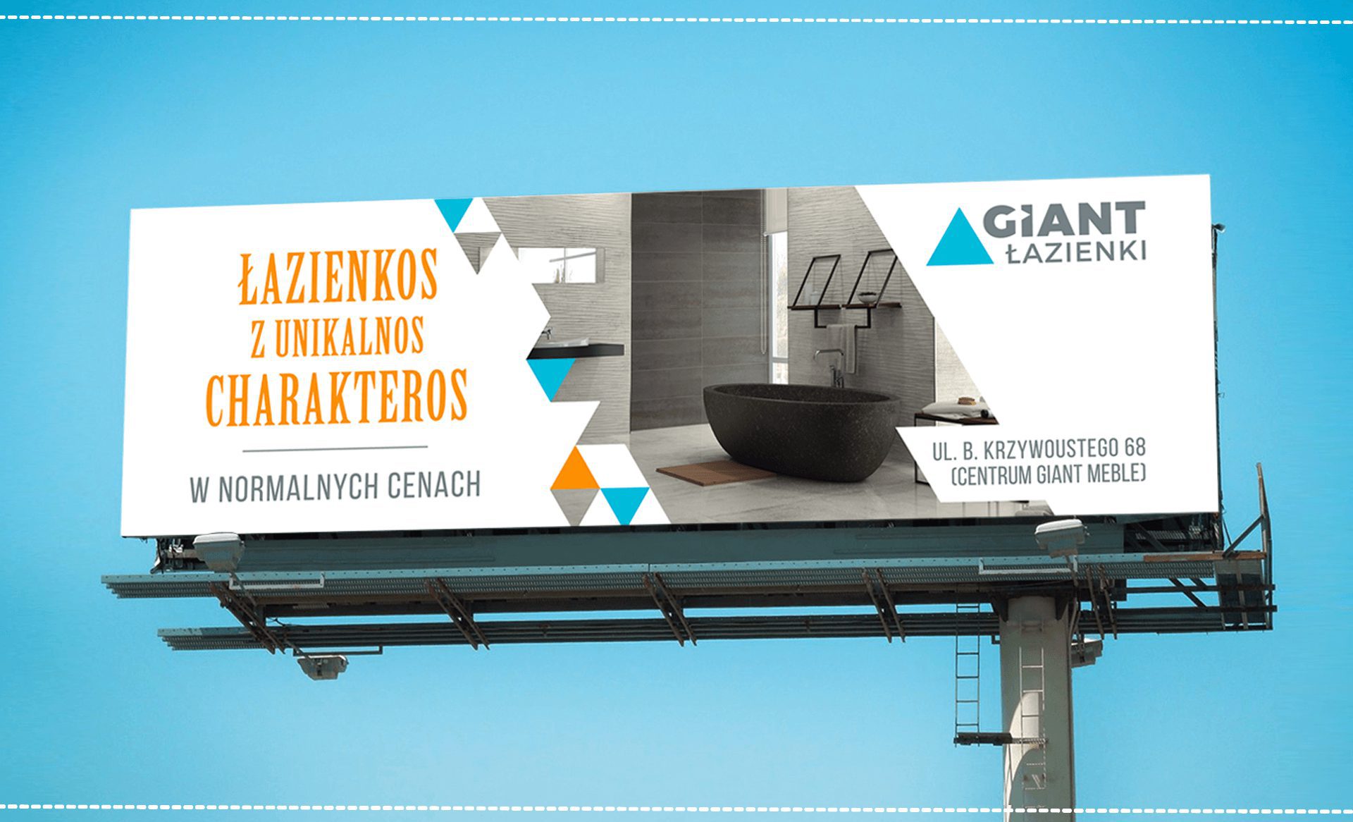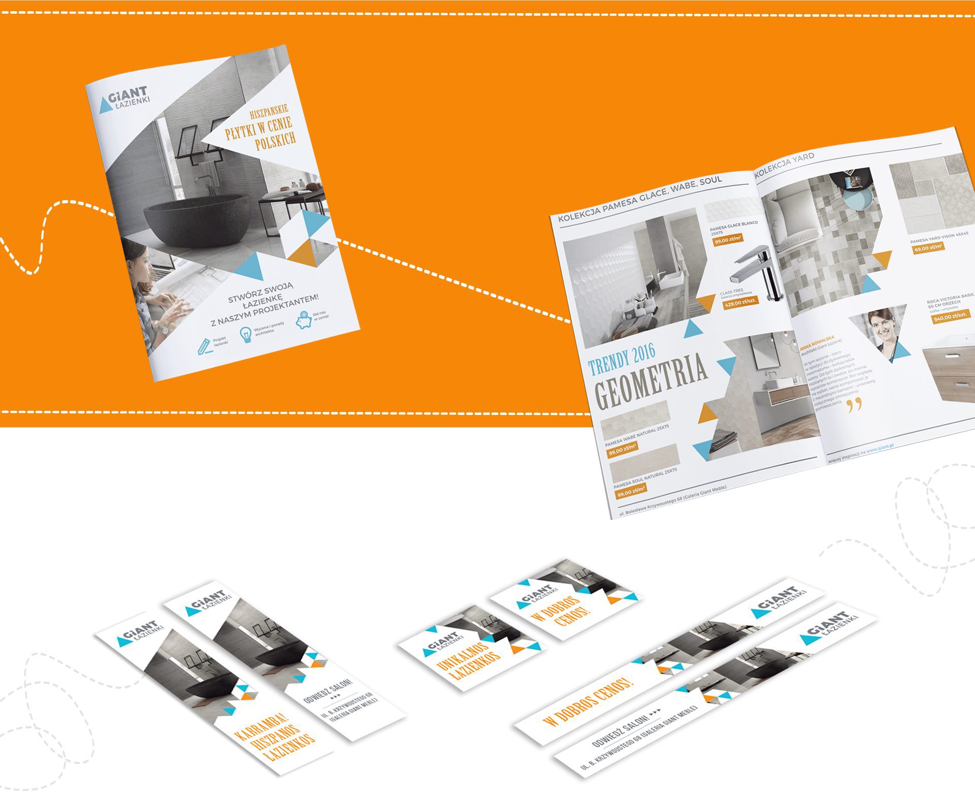 Giant, będący liderem na rynku wyposażenia łazienek to kolejna firma, której współpraca zaowocowała stworzeniem materiałów graficznych (bez zmiany logotypu), dopasowanych do specyfiki i potrzeb marki. Właściciele jako element wyróżniający wskazali największy asortyment hiszpańskich producentów. Tak wpadliśmy na pomysł wykorzystania w języku marki znanej zabawy czyli zamiany końcówek w wyrazach na „hiszpańskie”. Ponieważ marka dedykowała przekaz do młodej grupy wiekowej Klient uznał,  że może chwycić.